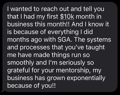 I had so much fun diving into each module and making tweaks and improvements to my business. There is so so so much value in SGA, It's worth every penny and more. You will receive so many golden nuggets of information and advice you can run with and make immediate improvements to your business with. This will literally accelerate your business so fast, and the process is fun and inspiring.Shannon, City & Sea Creative